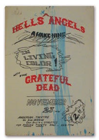From the personal collection of Debby Harry and Chris Stein comes this extremely rare original poster advertising the Grateful Dead's appearance in 1970 at the Anderson Theatre in New York presented by the Hells Angels. While this poster has some substantial damage, it is the only copy known of this rarity. VG, 7" tear, folds, tack holes and stains.
