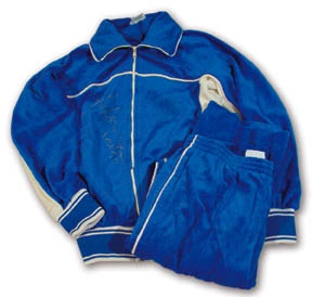 This two piece blue velour running suit was made by Levi's as an Olympic piece. It is signed on front and back and has U.S.A. logo.