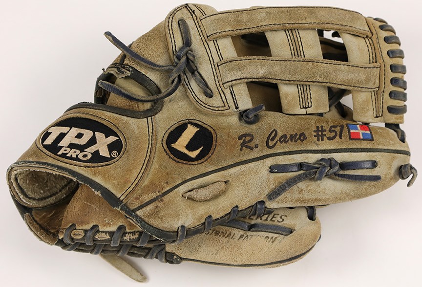 TPX manufactured glove "Pro Series." The glove is very well "broken in" and shows excellent use. "R. Cano #51" is embroidered on the thumb along with a Dominican Republic flag. Cano signed the back in blue marker, but is extremely faint and difficult to read.