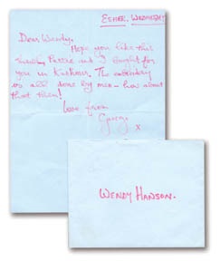Hand written to a friend, Wendy Hanson, circa 1967. The content mentions a gift George and Patty bought in Kashmir. Comes complete with matching envelope. VG+.