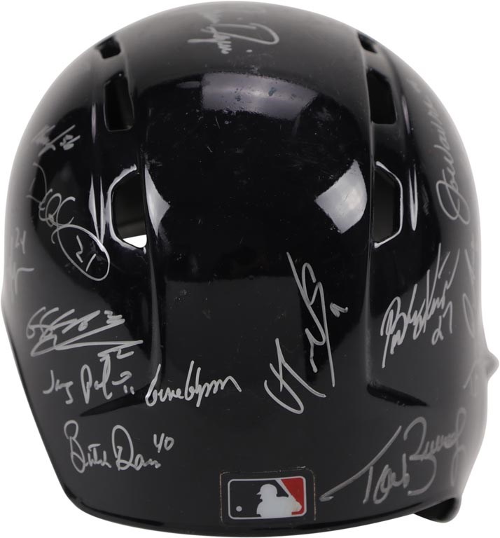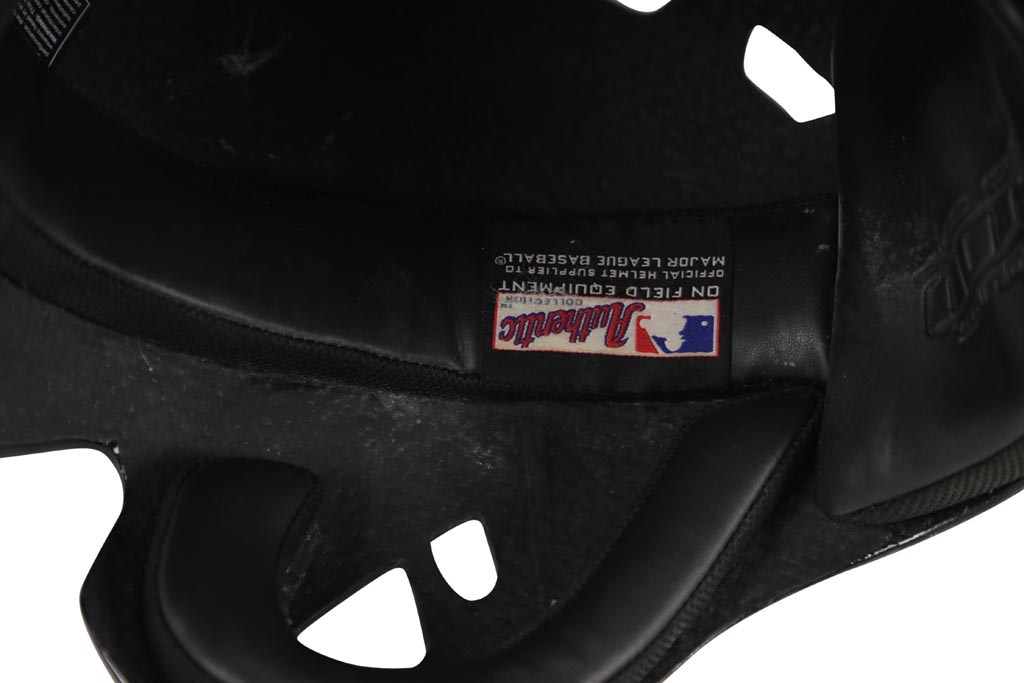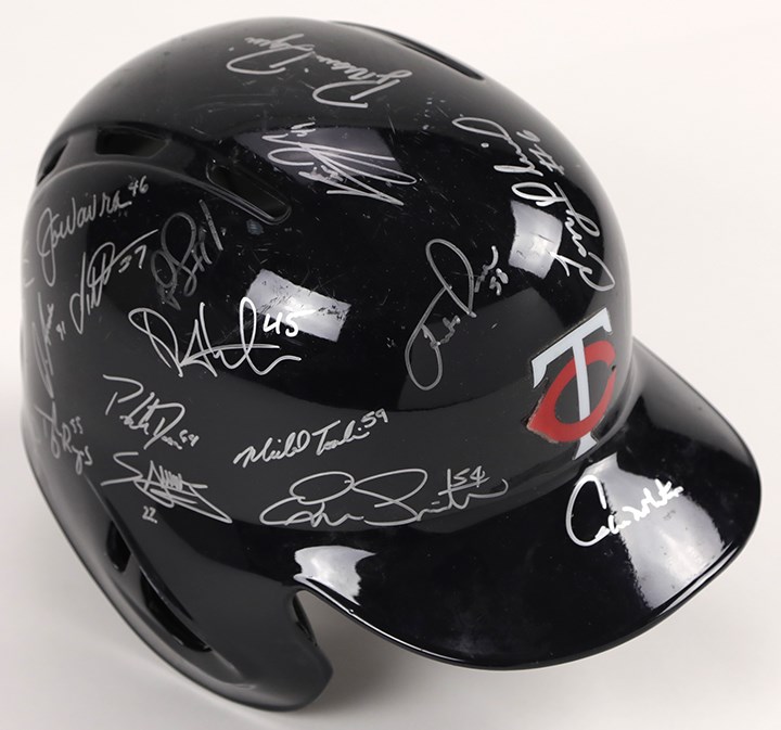 From the Minnesota Twins 2016 season comes this game used and signed helmet. The MLB Authentic size 7 1/4 helmet shows nice use with chips, dings and wear on the interior pads. Upon closer inspection, it appears that the helmet may have once worn the #30 on the back but has been removed. The 29 silver sharpie signatures look great on the dark Twins helmet and include Paul Molitor, Danny Santana, Miguel Sano, Phil Hughes, Joe Mauer and others.