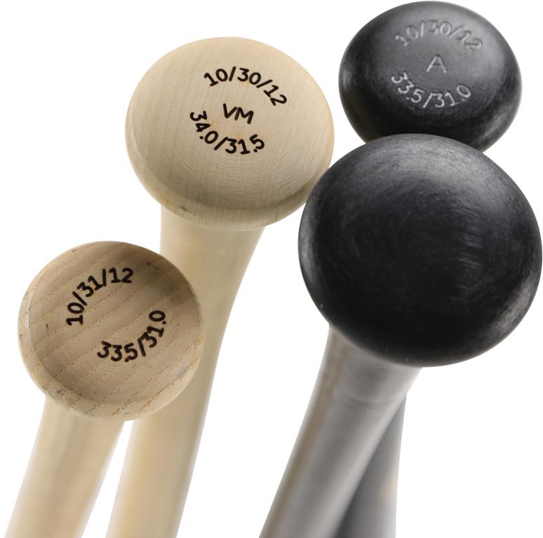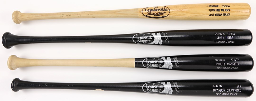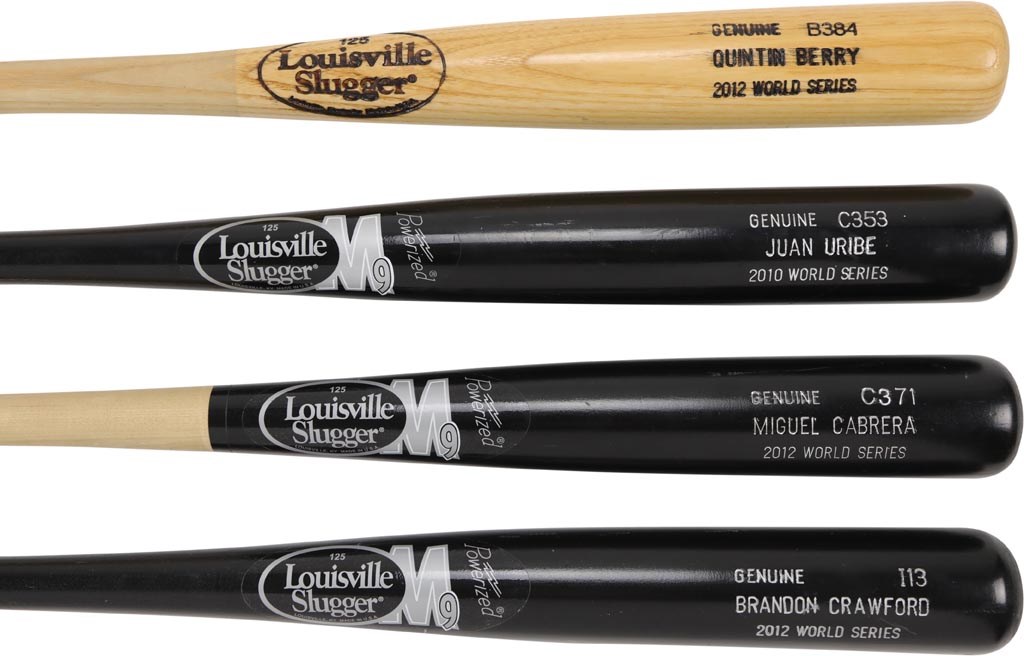 (1) Louisville Slugger Genuine C371 Miguel Cabrera 2012 World Series "10/30/12 - VM - 34.0/31.5" on knob, (1) Louisville Slugger Genuine C353 Juan Uribe 2010 World Series (34.5"), (1) Louisville Slugger Genuine B384 Quintin Berry 2012 World Series "10/31/12 - 33.5/31.0" on knob and (1) Louisvulle Genuine I13 Brandon Crawford 2012 World Series "10/30/12 - A - 33.5/31.0" on knob.