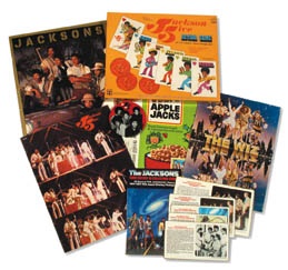From a private collector who stashd these Near Mint and unopened. You get the official Jacksons' Collector's Album Kit with flattened Apple Jacks cereal box promoting offer (1984); Kellogg's cereals & "Jacksons Victory Tour" supermarket hanging display & mobile (1984; 30" x 40"); "E. T." "The Extra-Terrestrial" Storybook Album Gift Set (1982); rare sealed Jackson Five board game; early Jacksons button and three program books including one with signatures of the band.
