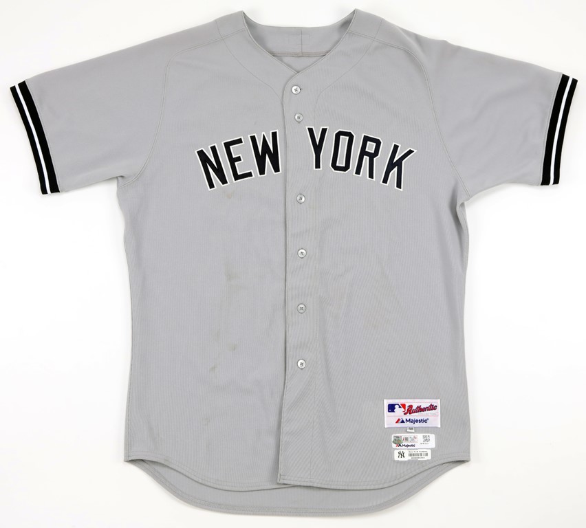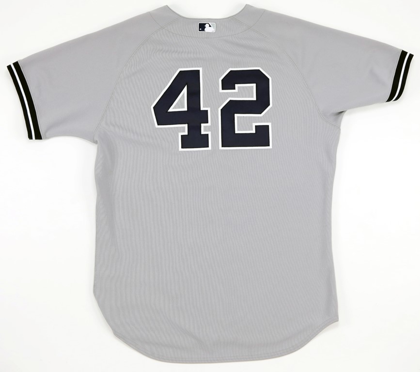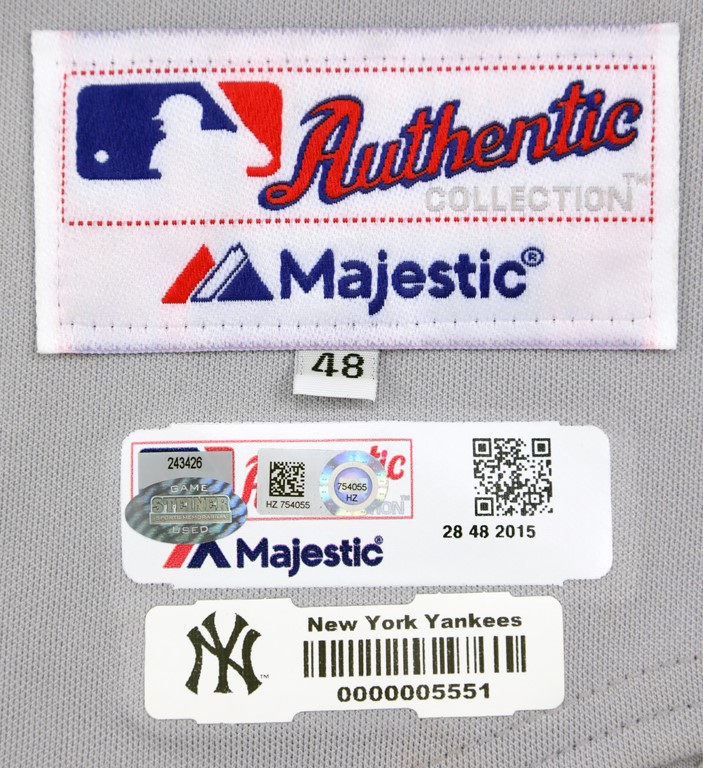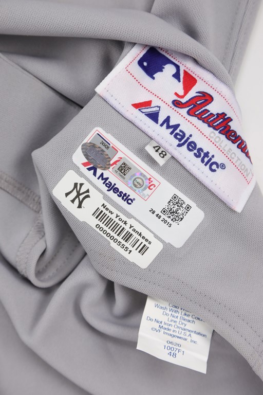New York Yankees 2015 Gray #42 Jackie Robinson/Joe Girardi game worn jersey. Once a year, Major League Baseball honors Jackie Robinson by having players, managers, and coaches all wear Robinson's famous #42. Thus, Yankee manager Joe Girardi wore his to honor the iconic Robinson. MLB Hologram #HZ754055. Tagged on front tail "Size 48." Also tagged on front tail "New York Yankees 0000005551." Also tagged on front tail "Majestic 28 48 2015," with hologram.