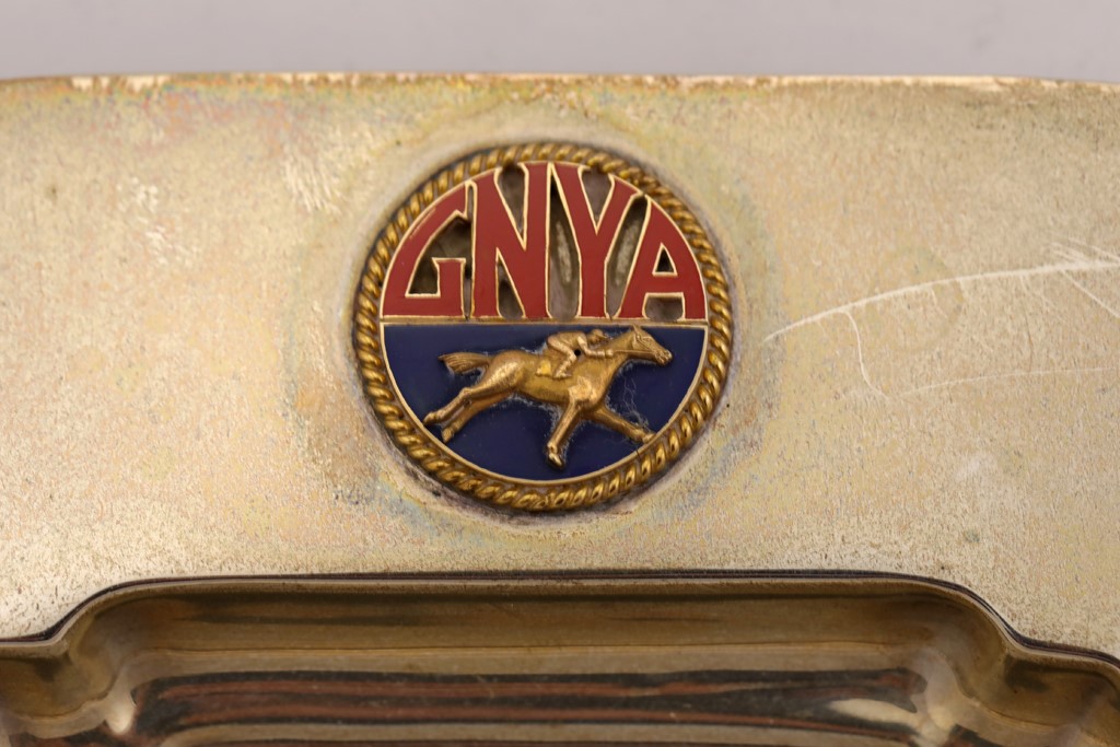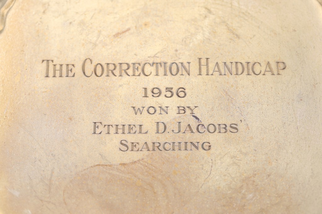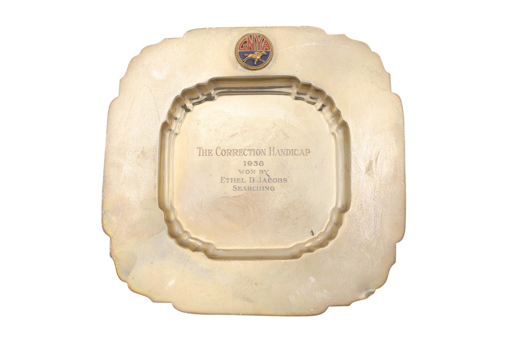 Pretty piece of horse racing memorabilia. Cartier Sterling Silver tray trophy presented to the winner of the Correction, Searching. Tray has the GNYA logo in red, blue, and gold on top and the engraved inscription: "The Correction Handicap, 1956, Won by Ethel D. Jacobs, Searching." Stamped "Carter Sterling" underneath. Searching was a Hall of Fame thoroughbred in her own right and produced another Hall of Famer, Affectionately. Lineage also includes War Admiral (sire), Man o' War (grandsire). Originally sold in the 2008 Christie's Important American Silver sale featuring the estate of Hall of Fame horse racing owner and trainer Hirsch Jacobs.