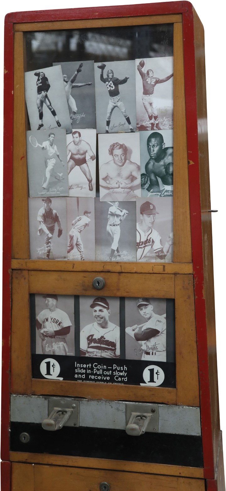 Fantastic original Exhibit Supply Co. vending machine from the 1950's. A rarely seen item and getting even harder to come by. This example has a wooden casing with two dispensers and a double sided glass display with a separate point of display area. The machine measures 6' high by 20" wide by 10" deep. The machine comes with the original point of display sign made of proof paper rather than cardboard which includes Mantle, Lopat, and Mitchell and reads "Insert coin-Push slide in-Pull out slowly and receive card" The Exhibit Supply Co. Chicago. The machine also comes with cards of: Feller, Boudreau, DiMaggio, Spahn, Layne, Waterfield, Baugh, Conerly, Bobby Riggs (tennis), Jimmy Carter (boxing), Gorgeous George (wrestling), and Lou Thesz (wrestling) behind upper display glass. The machine is missing its upper back cover which hid the upper glass display panel. Also, only one card dispenser is in working order and no keys are present. A rare and unusual collection centerpiece.
