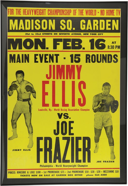 In 1967, Heavyweight Champion Muhammad Ali was stripped of his title for refusing induction into the armed services. The 1964 Olympic Heavyweight Gold Medalist Joe Frazier emerged as the best of a group of up-and-coming heavyweights during this period (1967-1970) when Ali was forced into retirement. Frazier won the New York version of the Heavyweight Title on March 4, 1968, stopping Buster Mathis in 11 rounds. He defended that title four times. On February 16, 1970, Frazier met Jimmy Ellis at New York's Madison Square Garden to determine the new Heavyweight Champion. Ellis could not stand up to Frazier's onslaught and was stopped in five rounds. Here is a very scarce, on-site poster for this event. Poster is a one sheet style and dry mounted. Has some creases where it was originally folded but still looks incredible and features bright and vibrant colors. Framed to 29x42" overall.